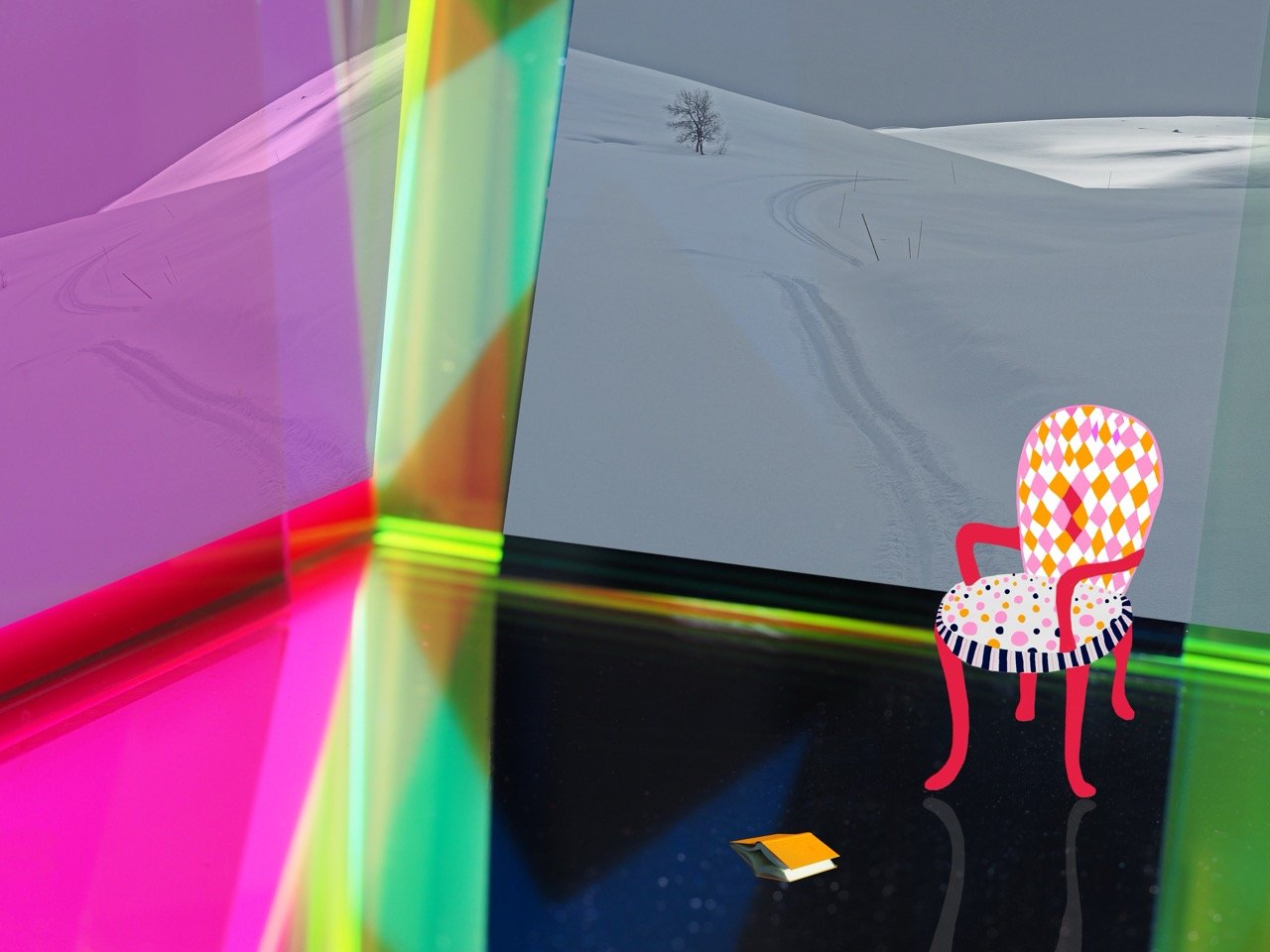 In “Mirrors and Crossings” solitary figures are reflected, mysterious openings lurk in the background, strong colors sit alongside with black and white photographs, empty roads seem to lead to crossroads, where the figures might meet no other than themselves. In this series everything is reflection, light comes from hidden sources, horizons are not always strait but tilt perilously to one side. The figures are absorbed in their thoughts and in the contemplation of the landscape. The abandoned boats suggest that somebody has arrived and went his way, but the boats could also take us on to long imaginary journeys. The chairs are empty or tilted, those who occupied them have left.